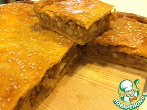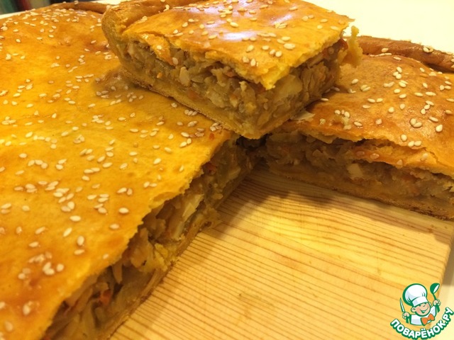 Второй частью накрываем пирог. Защипываем края. Накалываем вилкой, смазываем яйцом и посыпаем кунжутом. (По желанию)