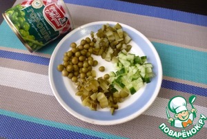 Нарезать огурцы мелкими кубиками, добавить зеленый горошек ТМ "Фрау Марта".