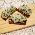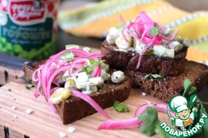 Всё готово, остаётся приготовить сами бутерброды. Для этого на кусочки поджаренного хлеба положить огуречный салат, а сверху положить отжатый от уксуса лук.