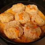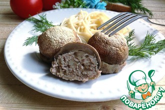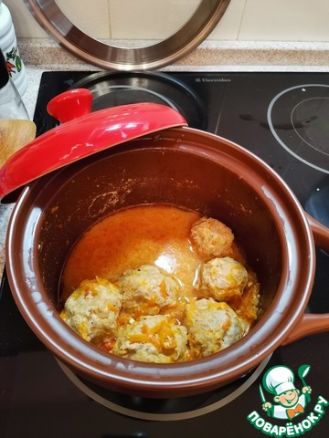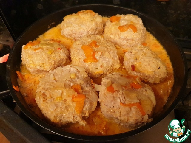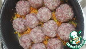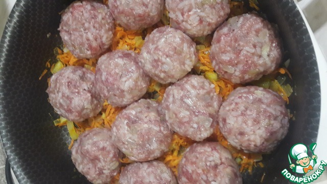 Далее обжариваем лук и морковь. Катаем шарики из фарша. И выкладываем их на зажарку.
