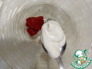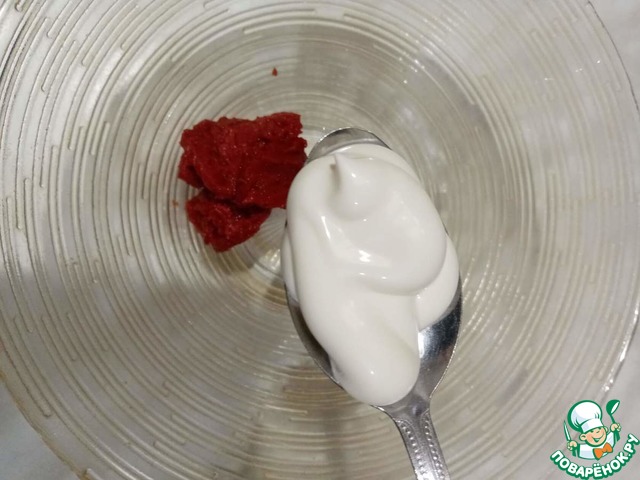 Делаем подливу. В миску добавляем 1 ст. л томатной пасты,1 ст. л сметаны (или майонеза)соль, перец, специ.