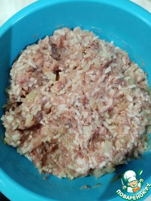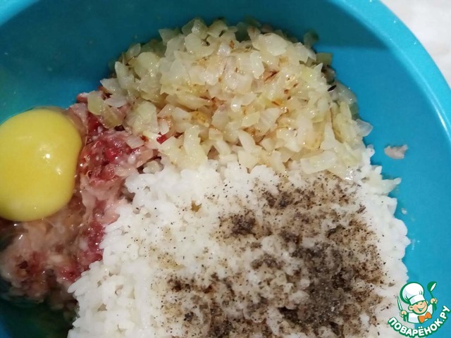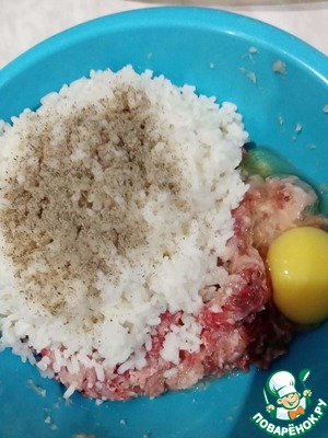 Дабовляем в фарш рис, яйцо, соль, перец.