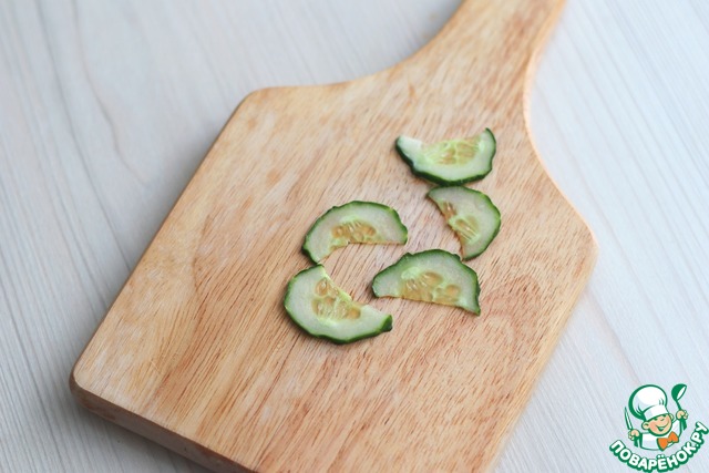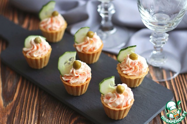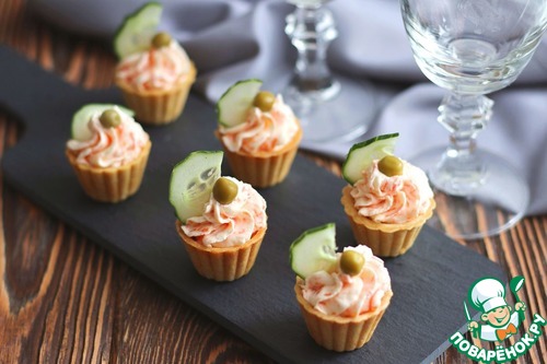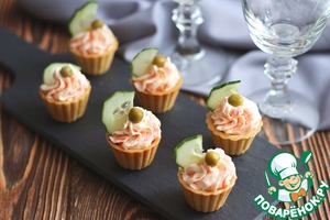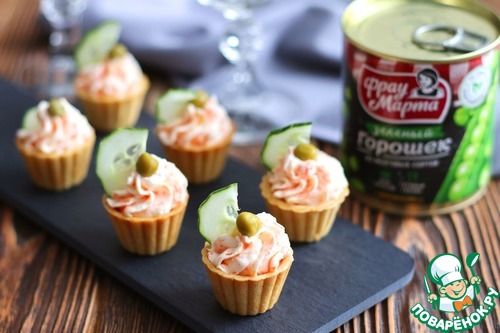На выпущенный в тарталетки крем, в качестве украшения, добавить консервированный горошек ТМ "Фрау Марта" и огуречные дольки.