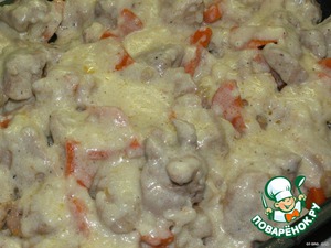 Сверху на картофель выложить свинину с овощами (прямо горячую), оставив жидкость, получившуюся в процессе тушения в сковороде.