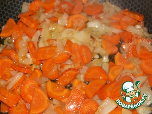 Морковь порезать полукольцами, добавить к обжаренному луку и тушить минут десять.