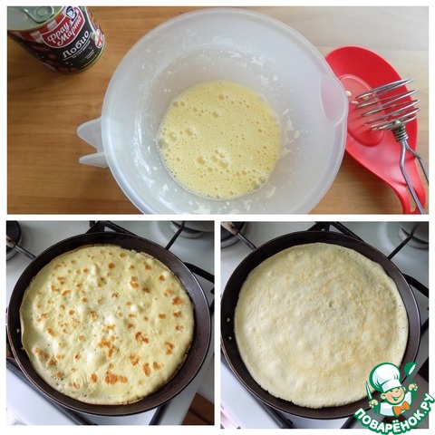 Ручным венчиком взбиваем в однородную массу. Выпекаем яичные блины. Из этого количества теста получится 2 блина D-24 см. Делаются блины очень быстро. Греем сковороду, кисточкой с маслом обмазываем её и разливаем ровным тонким слоем тесто. Яичные блины очень быстро схватываются и легко переворачиваются.