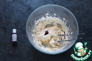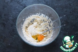 Сливочное масло и яйцо заранее достать из холодильника, чтобы они стали комнатной температуры. Сливочное масло взбить с сахарной пудрой и ванильным сахаром при помощи миксера на средней скорости около 2 минут. Периодически собирать массу со стенок посуды, чтобы всё тщательно смешалось. Добавить яйцо и взбить миксером около минуты.