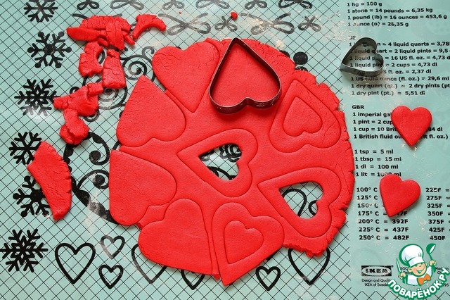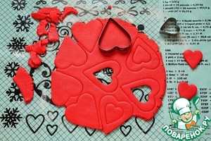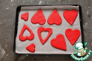 Тесто достать из холодильника. Если тесто провело в холодильнике более 4 часов, то оставить его на рабочей поверхности минут на 10-15, что бы оно согрелось. Раскатать тесто в пласт толщиной 0,5-0,7 мм. Вырезать печенье при помощи формы (размер большого сердца 9х9 см), половину печенья отложить, а во второй половине печенья вырезать ещё и сердечки меньшего размера (4,5х4,5 см). Остатки теста собрать, раскатать и вырезать ещё печенье.