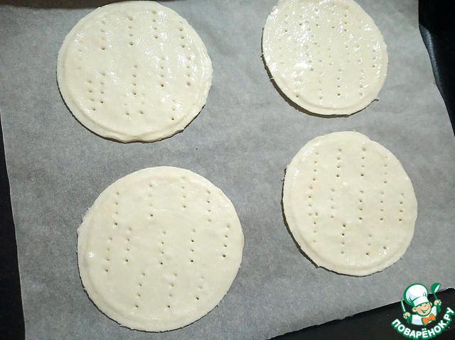 Выкладываем кружочки из теста на противень, застеленный пергаментной бумагой. Часто накалываем вилкой (чтобы тесто не очень поднималось при выпечке) и смазываем белком, чтобы скрепить нижний и верхний слои теста.