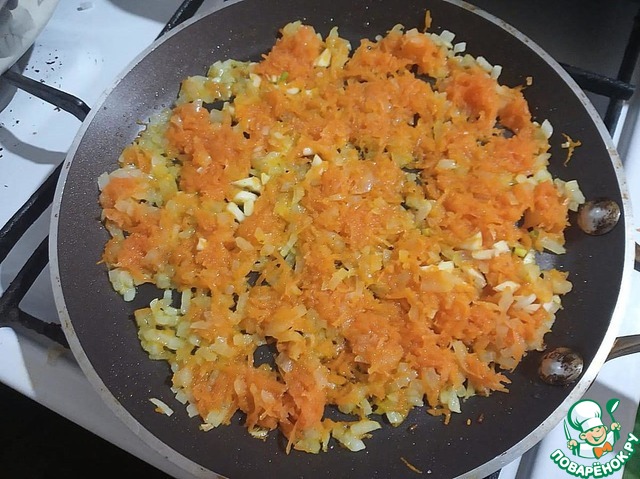 Лук мелко шинкуем, морковь натираем на мелкой тёрке. Пассируем лук в течении 1-2 минут, затем добавляем морковь, мелко порубленный чеснок и, помешивая, пассируем ещё несколько минут. Солим, перчим по вкусу, добавляем аджику, мелко порезанный укроп и пассируем, пока овощи не станут мягкими.
