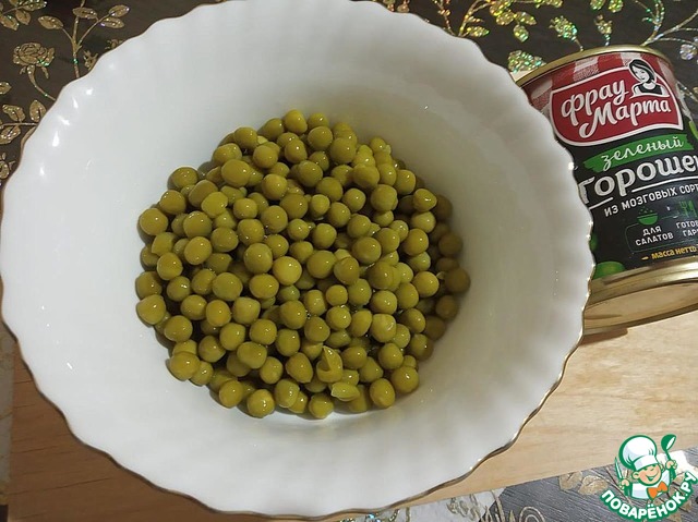 Откидываем зелёный горошек ТМ Фрау Марта на дуршлаг, промываем и даём стечь жидкости.