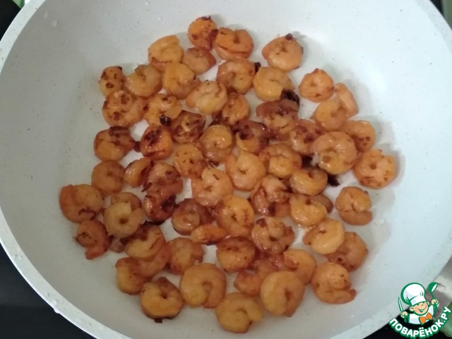 В сковороде на оливковом масле (2 ст. л.) обжарить нарезанную одну дольку чеснока, добавить креветки, соевый соус и обжарить до золотистости.