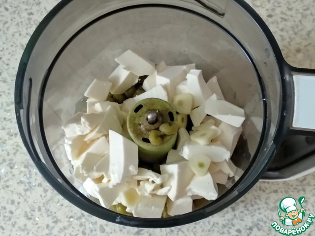 Добавить фету, одну дольку чеснока и 1 ст. л. оливкового масла. Измельчить до однородной массы. Можно использовать погружной блендер.