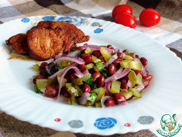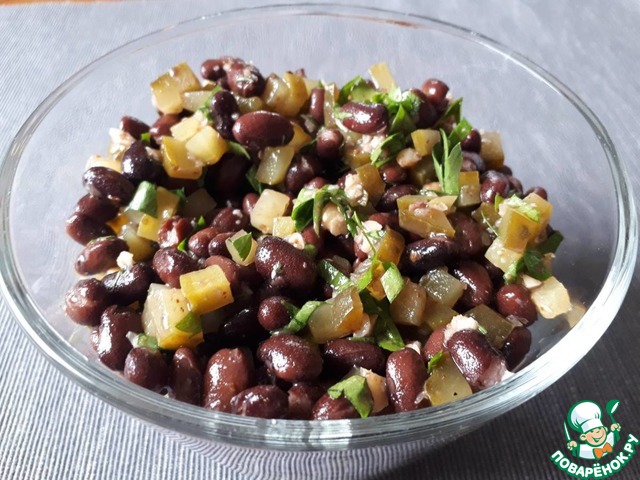 Очень понравилась закуска Искала куда пристроить несколько соленых огурцов и нашла эту закуску. Лук заменила на чеснок, для меня сочетание фасоли и орехов само собой подразумевает наличие чеснока Вот пишу, что называется, вприкуску Однозначно буду готовить еще, экспресс рецепт, к тому же практически всегда имеются ингредиенты. Думаю, что можно соленые огурцы заменить на маринованные (если нет соленых), а даже попробовать со свежими. Фото прилагаю.