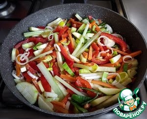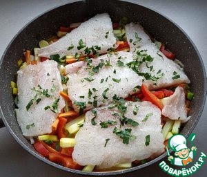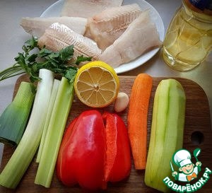 Рыбу посыпать солью, перцем и сбрызнуть лимонным соком. Сельдерей, морковь, чеснок, сладкий перец, кабачок порезать соломкой.