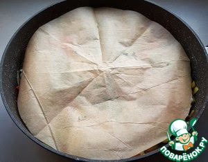 Из бумаги для выпечки вырезать круг диаметр по размеру сковороды. Накрыть рыбу бумажным диском и крышкой.