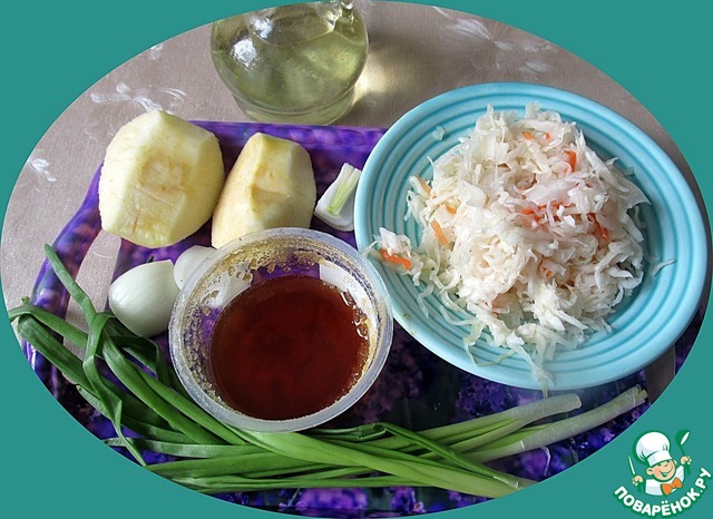 В миску укладываем отжатую от сока квашеную капусту, яблоко и лук.