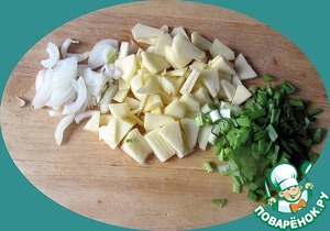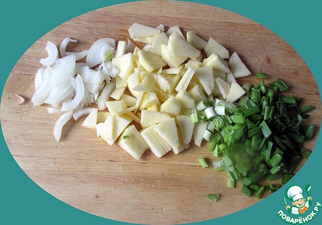 Репчатый лук нарезаем тонкими четверть кольцами, зеленый лук - колечками, очищенное яблоко - тонкими небольшими дольками
