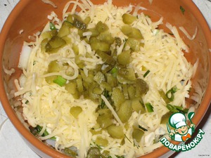 На сыр выложить порезанные огурцы, на огурцы остальной сыр.