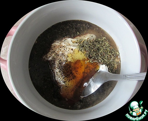 В чашку всыпаем специи, у меня французские травы, можно использовать любимые, по вкусу. Вливаем соевый соус, кладем сметану (20%-25% жирности), добавляем мёд. Перемешиваем.