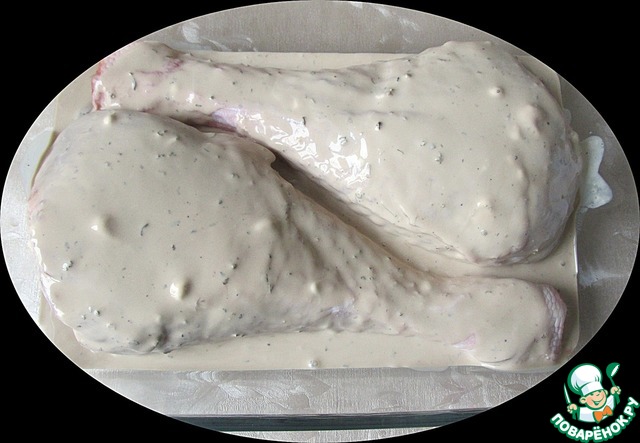 Оставляем голени в закрытой фольгой форме мариноваться на срок от 1 до 10 часов. При продолжительном мариновании убираем форму в холодильник.