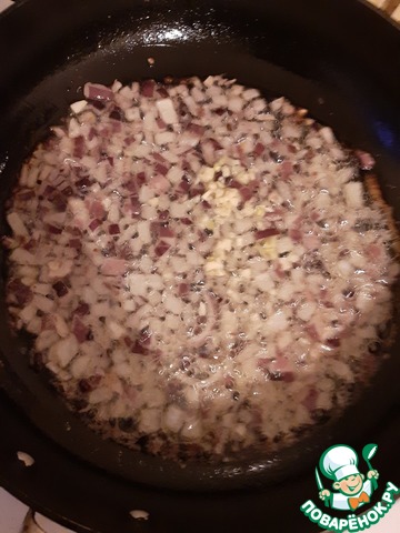 Мелко нарезать любой негорький лук - шалот, красный или белый. Вывалить на сковороду, обжарить до прозрачности и добавить мелконарезанный чеснок.