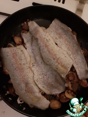 Как только грибы подрумянились с одной стороны, кладем сверху на грибы рыбу кожей вверх. Аккуратно солим и перчим только рыбу. Можно сбрызнуть растительным маслом.