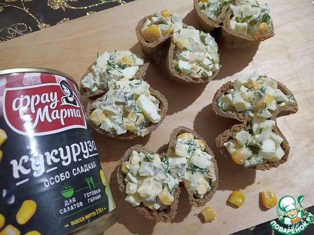Эта вкусная закуска - из сладкой кукурузы ТМ Фрау Марта, яиц и маринованных огурцов. А "Сделай сам" - потому что тарталетки будем делать сами.
