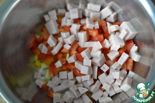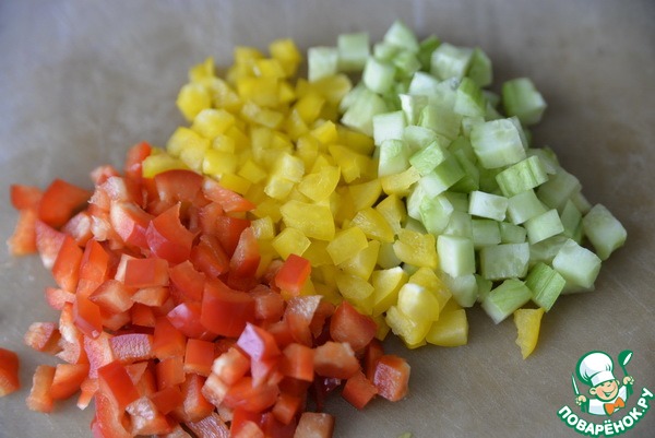 Берём огурец и болгарский перец красного и жёлтого цвета. Овощи моем, чистим, режем кубиками.