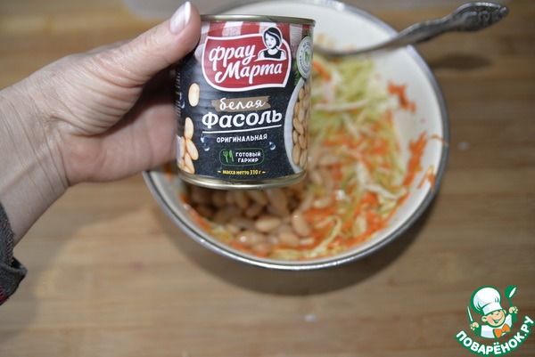Берём фасоль консервированную. Отцеживаем от жидкости, у меня белая, оригинальная "Фрау Марта". Кладём в салат.