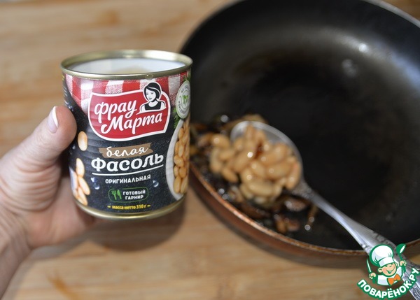 С фасоли отцеживаем жидкость, кладём к грибам. У меня белая оригинальная "Фрау Марта".