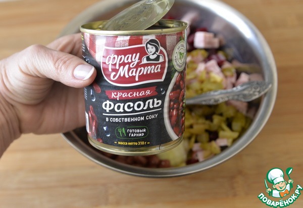 Берём фасоль, у меня красная в собственном соку "Фрау Марта". Кладём фасоль без жидкости в салат.