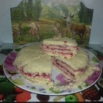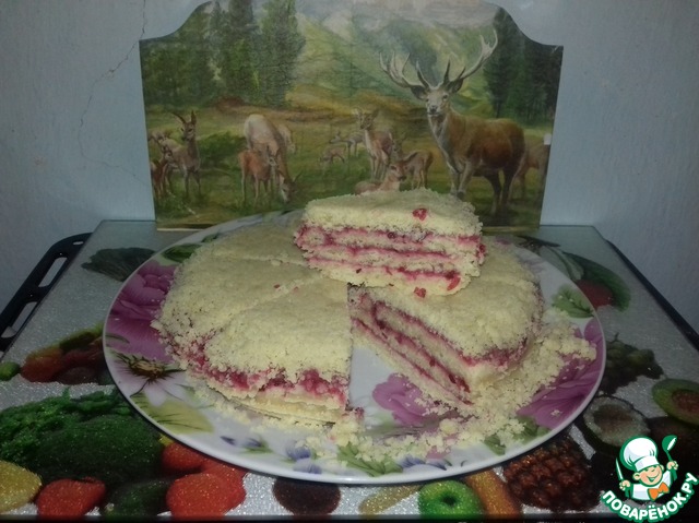 Для прослойки пирога я использовала смородину, протертую с сахаром. Намазывала коржи в теплом виде, чтобы варенье лучше пропитало коржи