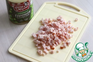 Копченую куриную грудку (180 гр.) нарезать мелкими кубиками.