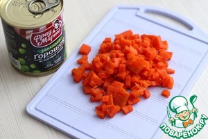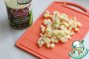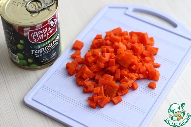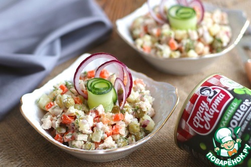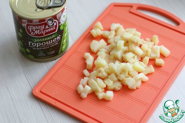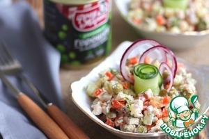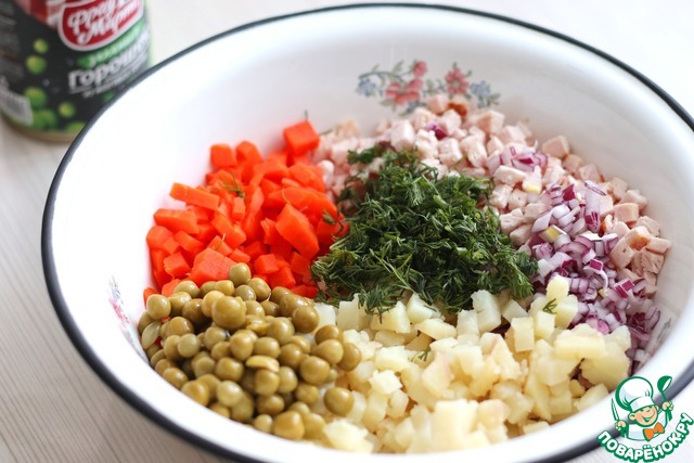 Соединить в миске все составляющие салата, добавить консервированный горошек ТМ "Фрау Марта" (3 ст. ложки), добавить свежую зелень укропа (1 пуч.). Заправить салат майонезом.