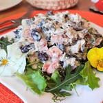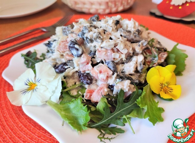 В миске соединить все составляющие салата, добавить консервированную белую фасоль ТМ "Фрау Марта" (2 ст. ложки). Заправить салат майонезом, при необходимости добавить соль по вкусу.
