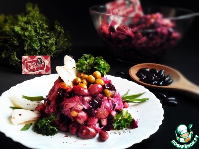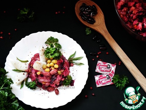 Предлагаю приготовить такой вариант винегрета. У салата очень яркий вкус, пикантную нотку салату придаёт использование овощной смеси "Mexico" от ТМ Фрау Марта, с очень вкусной заправкой. Просто, вкусно и сытно!