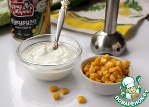 Соединить йогурт и кукурузу, хорошо размешать или ещё пару секунд измельчить блендером