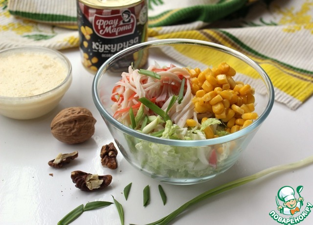 В миске соединить крабовое мясо, пекинскую капусту, кукурузу. Добавить нарезанный зеленый лук и грецкие орехи. Грецкие орехи предварительно подсушить на сковороде и измельчить удобным способом: прокатать скалкой, натереть на мелкой терке, нарубить ножом.