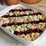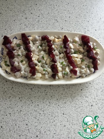 На салате сделать глубокие бороздки и аккуратно в них выложить свеклу, для этого можно использовать деревянные палочки.