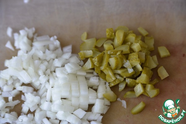 Также кубиками режем лук и маринованный огурец.