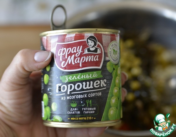 Кладём в винегрет зелёный горошек, у меня "Фрау Марта".