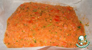 Сушеные томаты перемешиваем с мясом или просто намазываем на середину листа теста... сверху кладем мясо