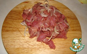 Мясо режем тонкими пластиками, солим, перчим, смешиваем с нарезанным луком...