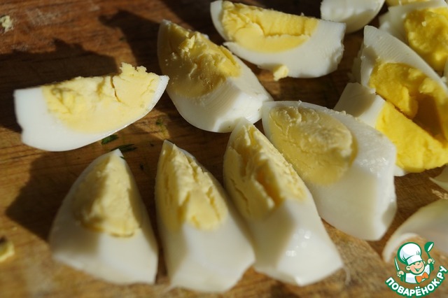 Перепелиные яйца отварить, очистить и нарезать на 4 части.