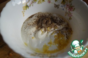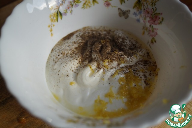 Сделать заправку. В сметану добавить свежемолотый душистый перец, сок и цедру лимона. Перемешать.