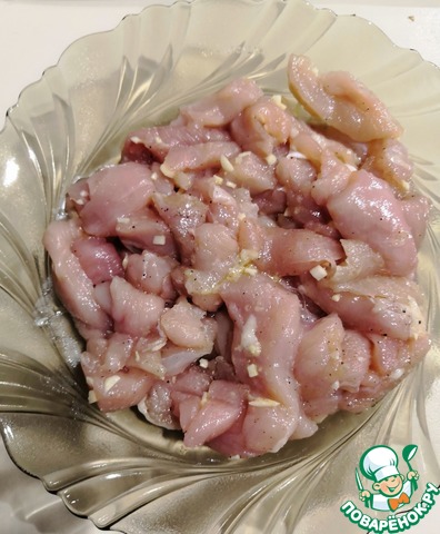 Сначала замаринуем куриное филе в оливковом масле с чесноком ( филе порезать тонкой полоской, чеснок измельчить) и солью. Оставить на 30минут