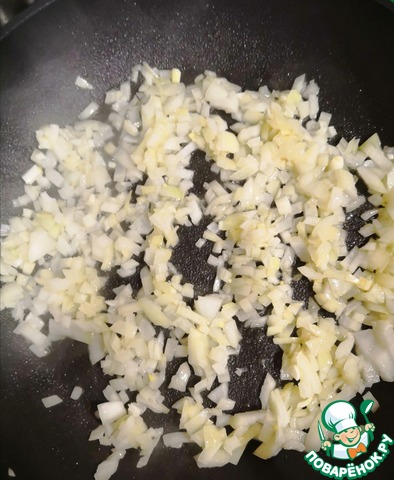 Лук порезать не крупным кубиком и обжарить на оливковом масле до прозрачности.