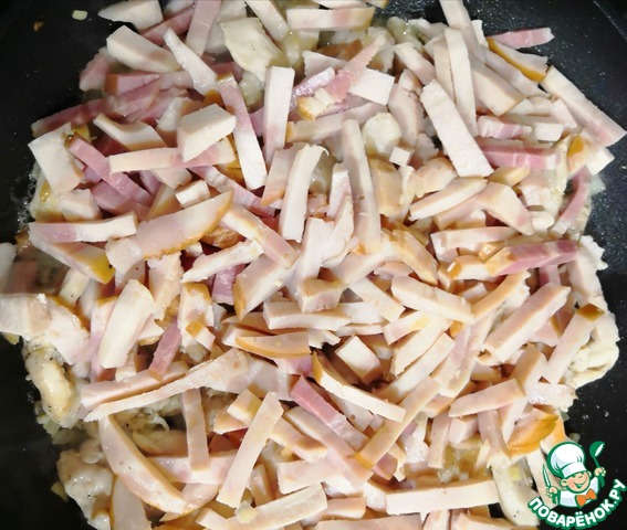 Дальше добавляем ветчину (предварительно порезав её соломкой) и продолжаем обжаривать до лёгкой золотистой корочки.