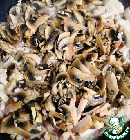 После добавляем грибы (порезанные пластиками). Посолить и поперчить по вкусу. Грибы дадут сок, обжаривать до выпаривания сока от грибов. Смесь приобретёт насыщенным аромат грибов